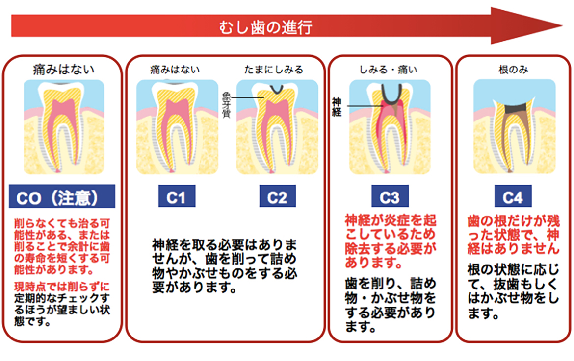 むし歯は早期(上記の C0、C1)に見つかれば、治療も痛くない場合が多いですし、治療期間も短く、その分費用も少なくて済みます。また、初期のむし歯であれば、削らずに予防処置により様子を見る場合もありますので、できるだけ早目に受診するようにして下さい。
